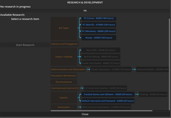 - Research Tree - Unlock 7 categories of technologies: Bot Types, Infection Methods, Payloads, Defense Evasion, Persistence, Reconnaissance, and Command & Control infrastructure